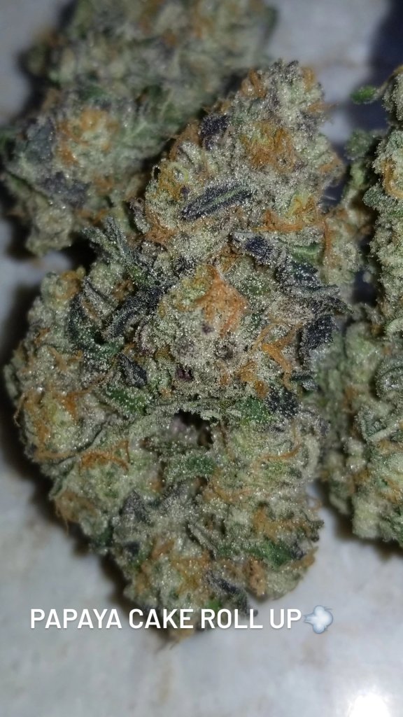 Papaya Cake- Papaya Cake is a perfect 50/50 mashup of Papaya and wedding cake.  Notes of sweet papaya come up first followed by a cakey, creamy nose that is very pleasant.  This translates exceptionally well in solventless processing hash rosin.  A good mid day or night time smoke.  She is versatile and earns her place in our rotation.
